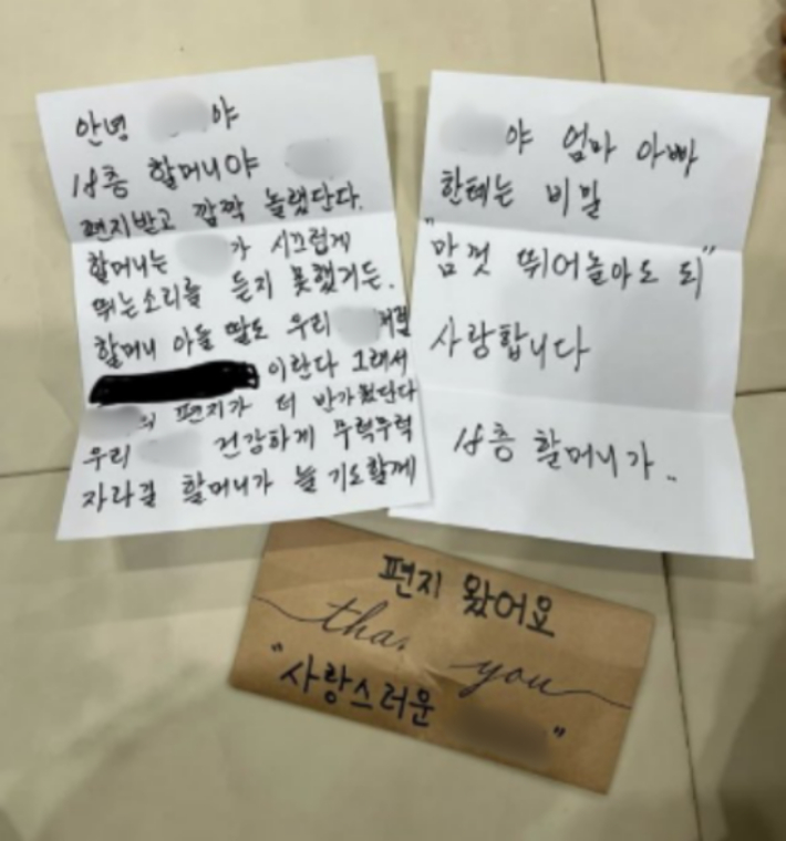 어린이의 부모는 "평소 아이들에게 주의도 주지만 그래도 소음이 있을 것을 알기에 아래층분들을 마주치면 항상 죄송하다"며 "아이들에게도 할머니, 할아버지를 보면 인사시키고 사과드리게 하는데, 그럴 때마다 웃으시면서 괜찮으니 아이들 기죽이지 말고 혼내지 말라고 하시는 마음 따뜻한 이웃"이라고 전했다.